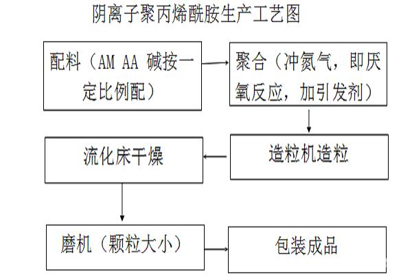 此工藝制備的共聚型陰離子聚丙烯酰胺分子量高,水溶性好,產(chǎn)品在水處理領(lǐng)域絮凝效果特別好。以下為陰離子聚丙烯酰胺生產(chǎn)工藝流程圖: